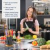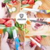 - QUALITY ☆ Our kitchen set includes professional 5CR15MOV Steel Knives, ergonomic soft grip handles, Dupont Nylon Utensils, and a smooth rotating stand. The Excellence Series features a bright and colourful award winning design that will be sure to invigorate any kitchen it enters. Elevated and weighted utensil handles feature “No Mess” raised heads so your counter stays clean